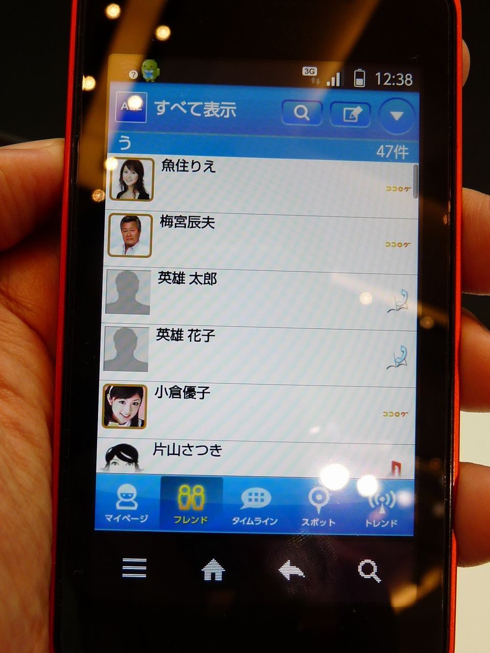 「jibe」の「フレンド」画面。芸能人・有名人の名前と共に、Android端末の電話帳に登録されている名前が表示されています。自分がよくblogを読んでいる芸能人・有名人も端末の電話帳に登録されている知人も全て一元管理できます。