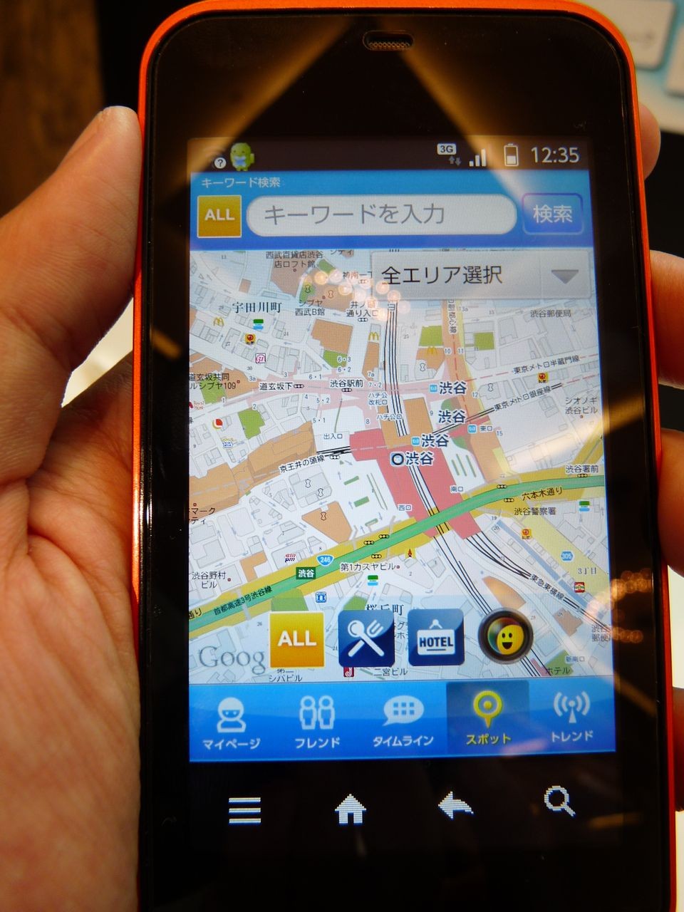 「スポット」で渋谷駅周辺のホテルを検索したところです。