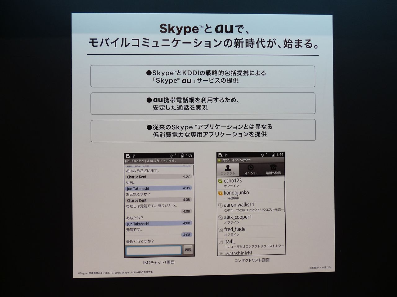 KDDIは今回、スカイプ・テクノロジーズS.A.社と戦略的包括提携に合意したことを発表し、2010年11月下旬以降に発売となる「IS03」向けに「Skype au」アプリケーションを提供し、以後発売されるAndroidスマートフォン、そして2011年にはau従来型携帯電話へと提供の対象を広げることが発表されました。