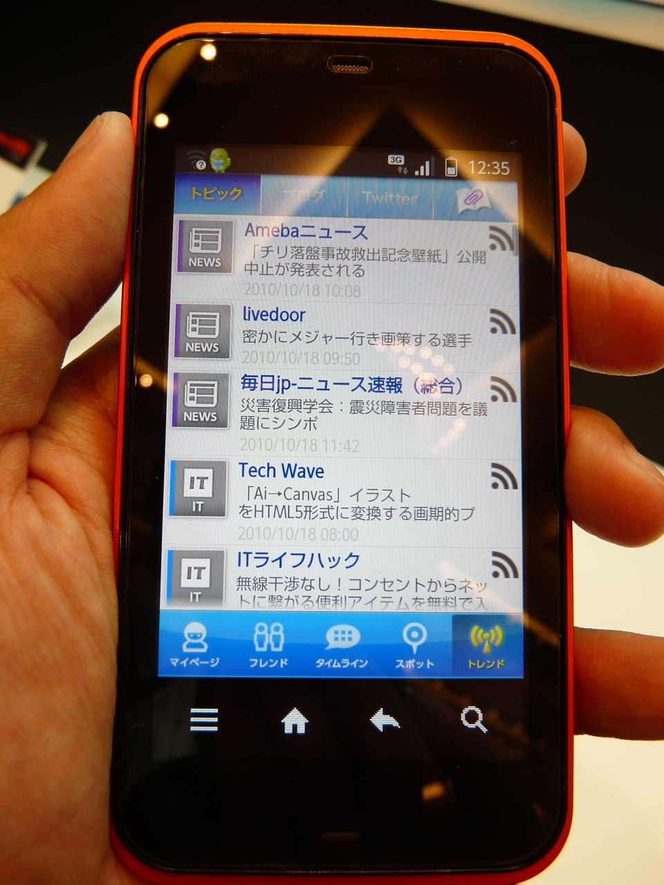 「jibe」の「トレンド」画面。トピックはRSSリーダーで最新のニュースが読めます。また芸能人・有名人のブログやTwitterが登録されており、自分がTwitterなどをやっていなくても楽しめる仕組みになっています。