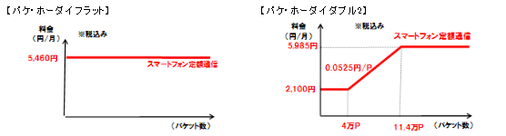 新しく導入されるパケット定額オプションのうち、パケ・ホーダイ フラットは、完全定額制(フラット型)のパケット定額サービスでスマートフォンで利用した場合には月額5,460円で利用可能となっています。従来のパケ・ホーダイ ダブルの上限額と比較するとフルで利用した場合には525円割安になります。