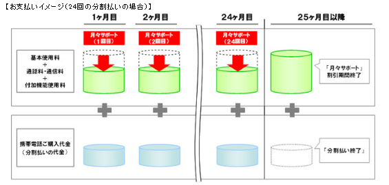 従来の端末購入時に端末の代金から値段を割引していた方式とは異なり、機種ごとに設定された一定額を毎月の利用料金から割り引くサービスとなっています。購入した月を1ヶ月目として、最大24ヶ月間、各種割引サービス適用後の毎月の利用料金から割引がなされます。