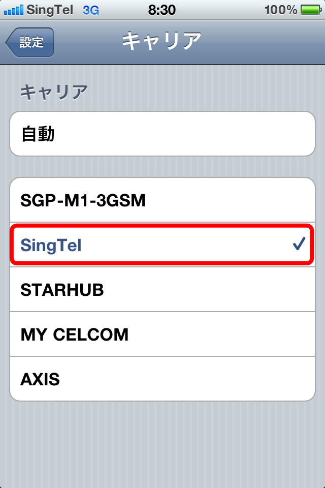 さて無事に海外に渡航して、携帯電話の電源を入れた後、まっさきに事業者設定画面を開き、それぞれの定額対象事業者(SoftBankならSingTel、docomoならStarHub)を選択します。