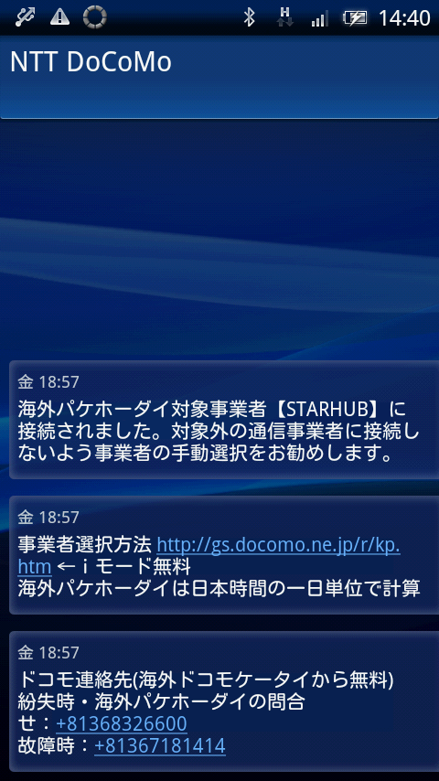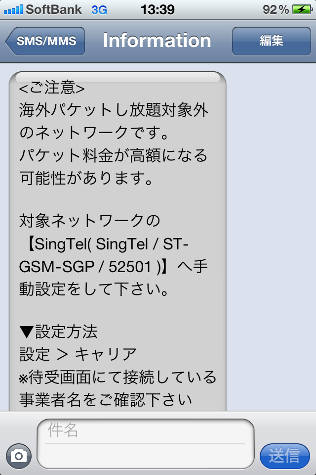 定額対象事業者に無事に接続(ローミング)できたら、間もなくSoftBankやdocomoやから「定額対象事業者ですよ」というメール(SMS)が届くはずです。実は私の場合、最初にiPhone 4が定額対象外の事業者に接続されてしまい「定額対象でないので注意」というSMSが届いてしまいました。しかしこの時点ではデータローミングがOFFになっているので海外でのパケット通信が発生することはありません。落ち着いて定額対象事業者(SingTel)に切り替えて事なきを得ました。