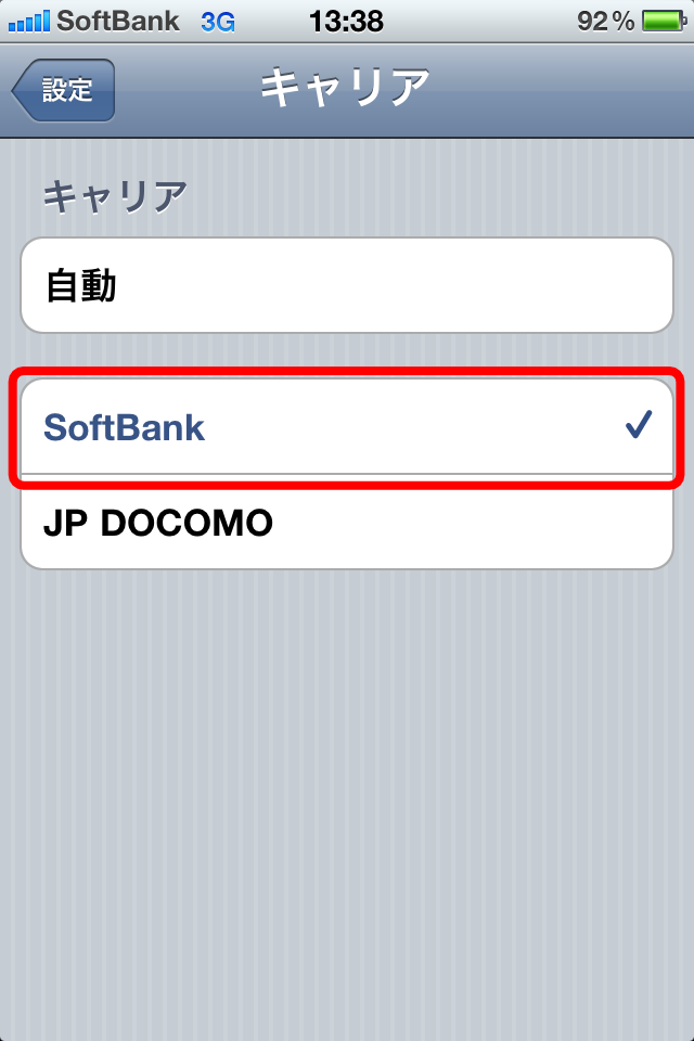 次に予想外の事業者が選択されないよう、事業者選択も手動でdocomo(あるいはSoftBank)を選択しておきます。設定する場所はiPhone 4では「設定」→「キャリア」、Xperiaでは「設定」→「通話設定」→「ネットワークオペレーター」となります。