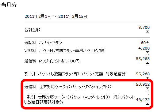 SoftBankの場合、「世界対応ケータイ」として通信料が一旦計上され、その後「海外パケットし放題」で割り引かれるという記述になります。私の場合、通信料が50,912円、割引が46,472円ですから、差し引き4,440円。これを日数(3日)で割ると1日あたり1,480円となり、海外パケットし放題が問題なく適用されていることがわかります。