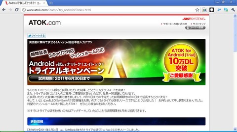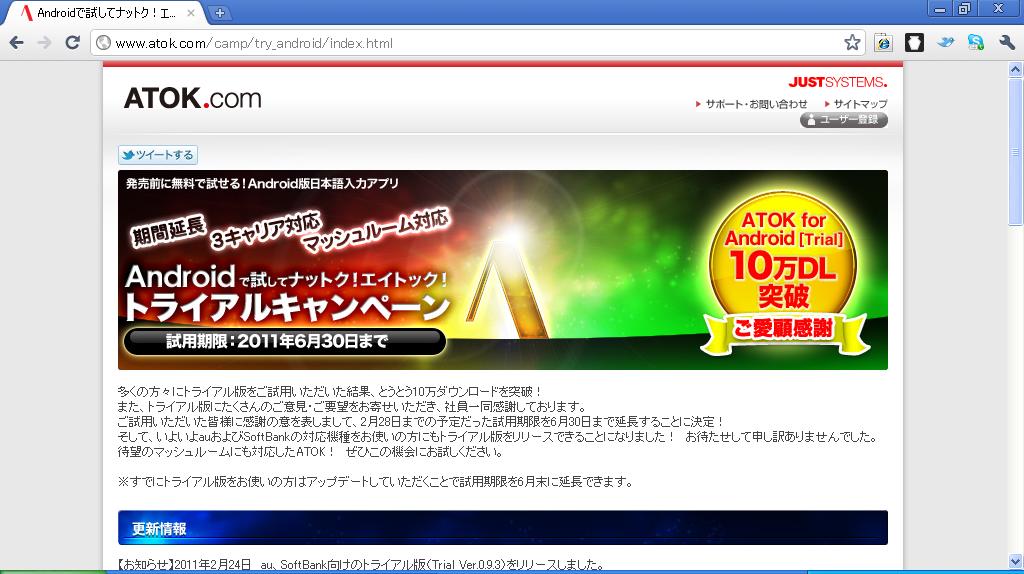 本日2月24日、ジャストシステムは「ATOKトライアル」の無料での使用期限を6月30日まで延長することを発表しました。また、大幅な機能拡充が行われ、ドコモに加え、新たにau・ソフトバンクモバイル向けに「ATOKトライアル」をAndroidマーケットに公開しました。ドコモ版はバージョンアップを行えるようになっています。そして、マッシュルームアプリにも対応しました。