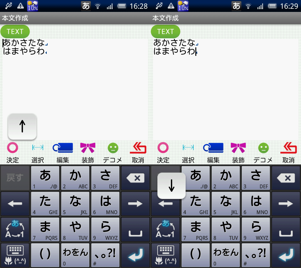 また、左右の矢印アイコンを上方向にフリックすると上に、下方向にフリックすると下にカーソルを移動させることがでいます。また、右矢印アイコンを左方向にフリックすると左に、左矢印アイコンを右方向にフリックすると右にカーソルを移動させることができます。