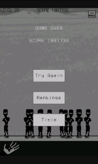 ゲームオーバー時の画面。即座に最初から再挑戦やランキング登録もできます。