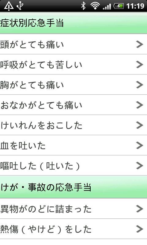 「救命・応急手当の基礎知識」はAndroidアプリ「家庭医学大全科」(3,700円)から特に救命・応急手当に関する内容を抜粋し、東北関東大震災への支援として無料で公開されているものです。ケガや事故の応急手当など、災害時に具体的にどうすればいいのかが解説されています。特に心肺蘇生法や止血法などについては、図入りで手順が示されています。