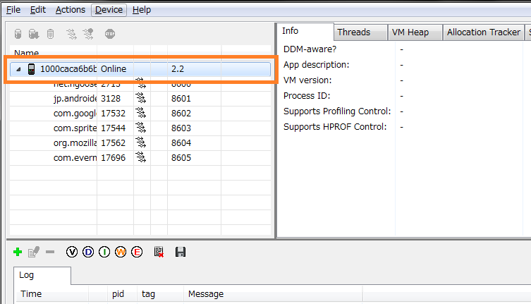 - "android-sdk-mac_86" → "tools" → "ddms" 起動。