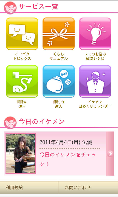 au one Woman Styleのトップページには「イドバタトピックス」「くらしマニュアル」「レミのお悩み解決レシピ」「掃除の達人」「節約の達人」「イケメン日めくりカレンダー」のカテゴリーが並ぶ。