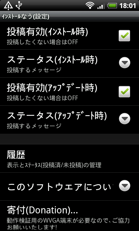 | 項目 | 詳細 | 投稿有効(インストール時) | アプリをインストールした際につぶやく(ON/OFF設定) | ステータス(インストール時) | 投稿内容を設定する | 投稿有効(アップデート時) | アプリをアップデート(更新)した際につぶやく(ON/OFF設定) | ステータス(アップデート時) | 投稿内容を設定する | 履歴 | 表示とステータス(投稿済/未投稿)の管理 | このソフトウェアについて | インストールなうについての説明 | 寄付(Donation)... | リンク先にアクセスして開発のための寄付ができる |