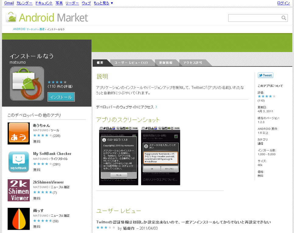 Androidマーケット:http://market.android.com/search?q=com.matsumo.installnow