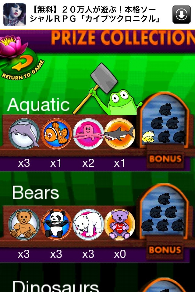 右下の『PRIZES』をタップすると今まで取った動物を見ることができ、BONUS枠に黄色のカエルが現れるので頑張って数を動物確保して黄色のカエルを増やしましょう。