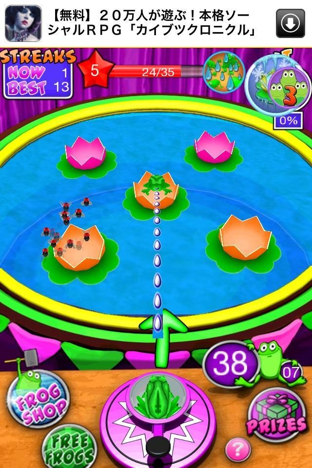 カエルをジャンプさせたい方向にフリック!フリックの強弱で飛距離が変わります。成功すると、的の色が変わり5つ全ての的に入れるとレベルアップしていきます。