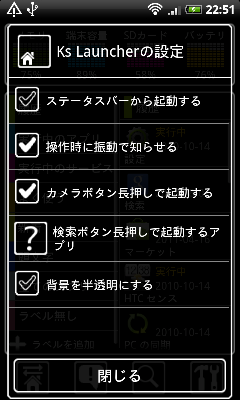 そのため、Ks Launcherの設定画面では、「ステータスバーから起動する」や「背景を半透明にする」といった設定がある。