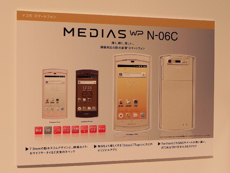 既報の通り、NTTドコモは16日、「2011年夏モデル 新商品・新サービス発表会」を行い、NECカシオモバイルコミュニケーションズ製のシリーズ最新モデルとなる「MEDIAS WP N-06C」(以下、MEDIAS WP )を発表した。