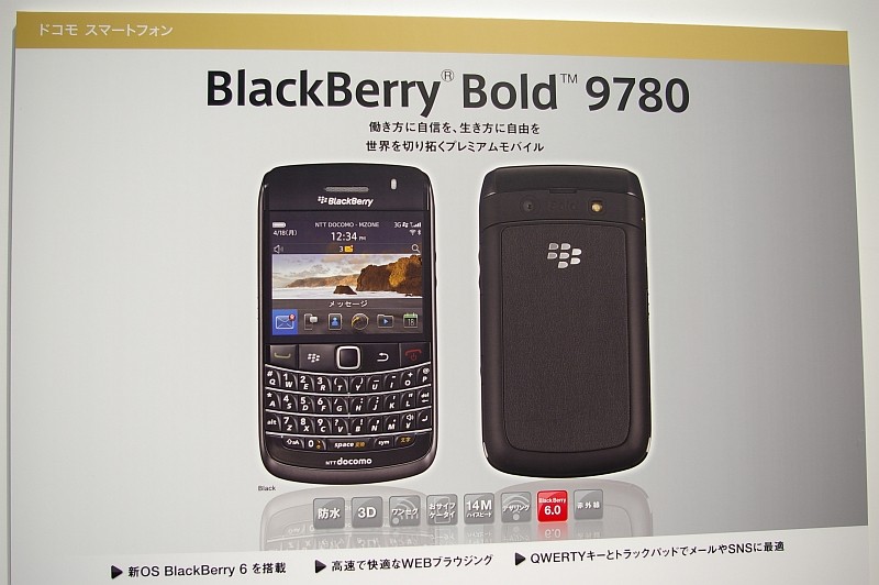 既報の通り、NTTドコモは16日、「2011年夏モデル 新商品・新サービス発表会」を行い、RIM製「BlackBerry Bold 9780」を発表した。今夏のスマートフォンで、唯一のAndroidではない機種となっています。