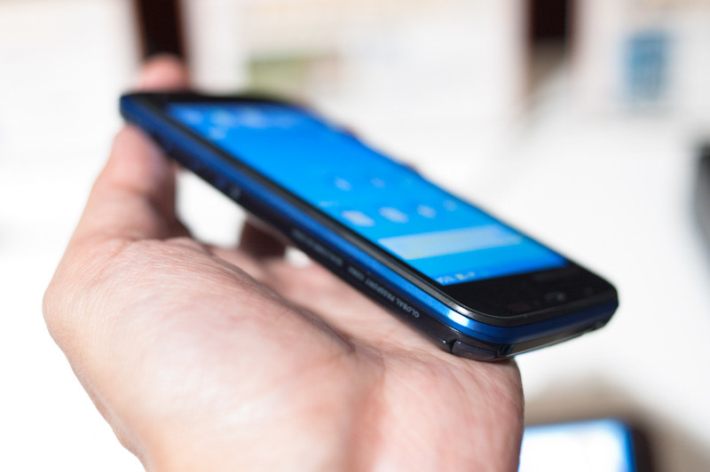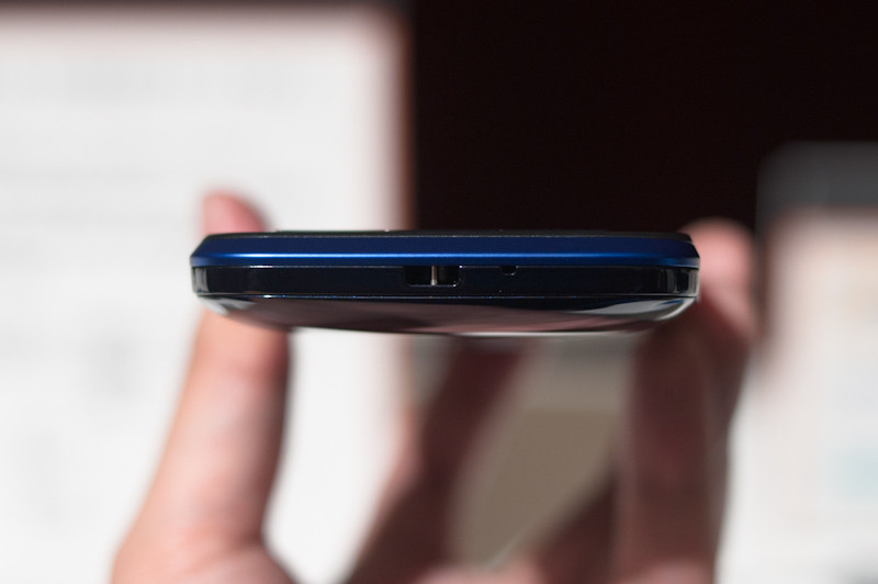 右側面には、左からシャッターボタン、ボリュームボタン、電源・ロックボタンが配置されている。右側の膨らみの先端にはワンセグ用のアンテナがある。