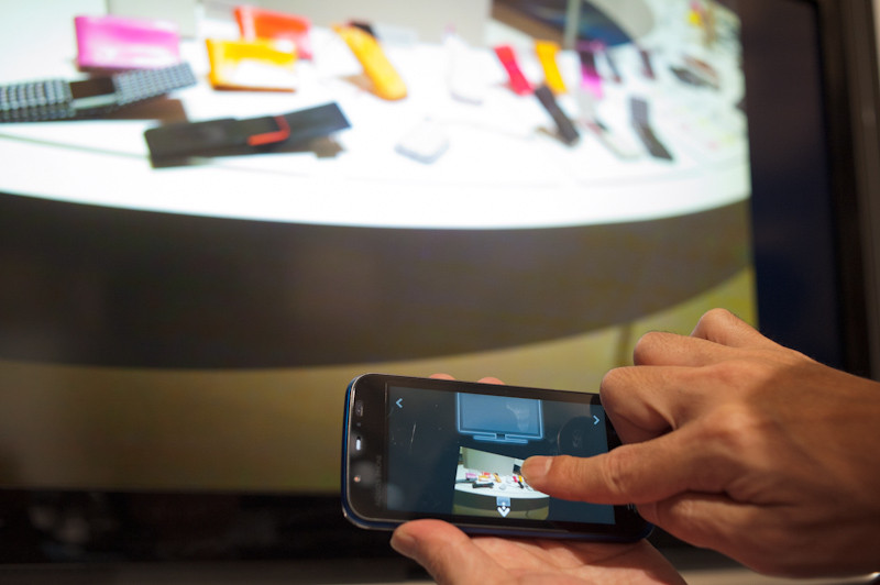 AQUOS PHONEの映像をAQUOSに簡単に出力出来る。ゼスチャーにより表示の切り替えも簡単。写真は、画像を下へドラッグして表示中のAQUOSの映像を消すジェスチャーだ。