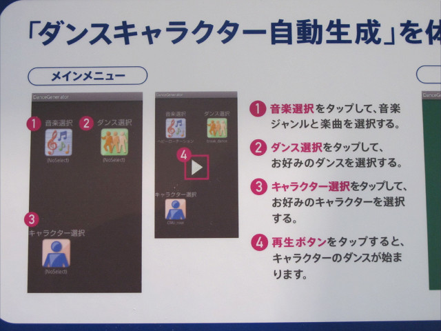 ワイヤレスジャパン2011のKDDIブースにて、現在開発中のアプリ「ダンスキャラクター自動生成」が公開されていましたので紹介します。