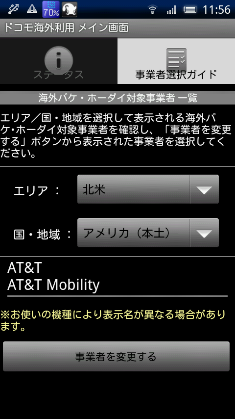 海外に着いた後使用する事業者を変更する時は、「事業者選択ガイド」のタブをタッチし、エリアと国・地域を選択すると、対象事業者が現れ、「事業者を変更する」をタッチすることで、事業者の変更ができます。