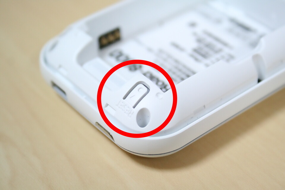 バッテリーカバーを外した本体上部にリセットボタンを備える