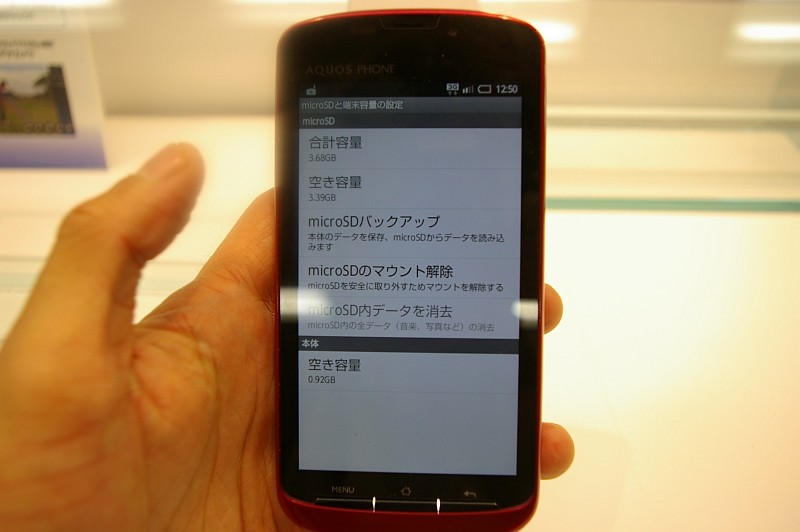 一方で、折りたたみ型で完成度を高めていて、かなり評価の高いAQUOS PHONE HYBRID 007SH/007SH Jについては、記録用本体メモリ(ROM)がトータル1GB、空き容量約205MBと少なくなっているのが少し残念なところです。サイズもコンパクトだったりするので、なかなか部品的に難しいところもあるのかもしれませんが、惜しいですね。