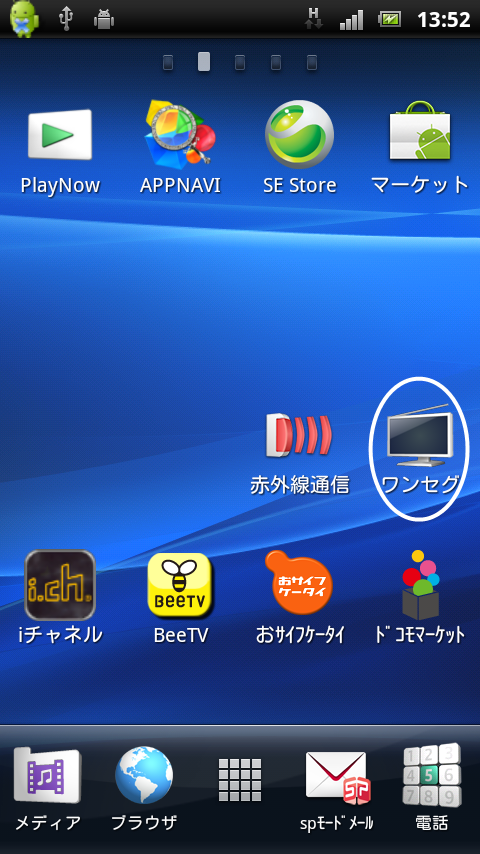 ワンセグへのショートカットは、出荷状態のホーム(待受)画面に用意されています。もちろん、アプリ一覧にもショートカットはあります。