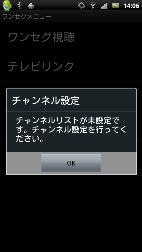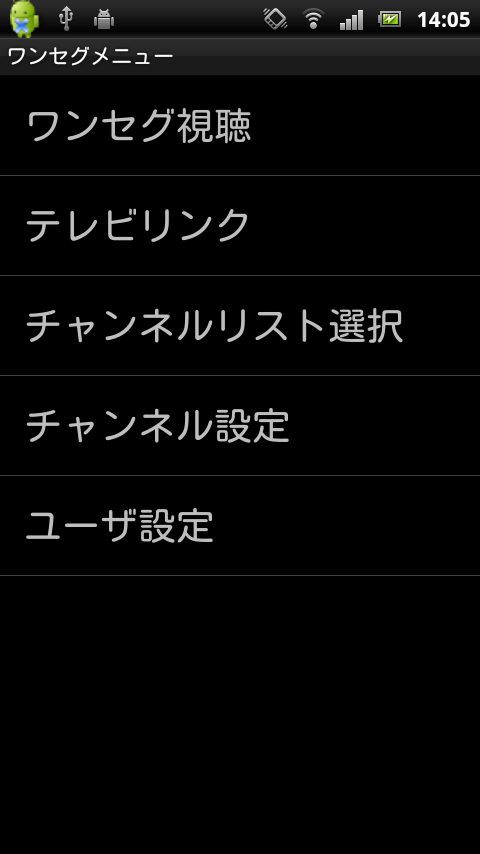 ワンセグメニューを起動すると、ご覧の様なメニューが表示されます。ここで、「ワンセグ視聴」を選べばワンセグを見ることができます。チャンネルリスト(受信地域設定)が終わっていない場合、チャンネルリストの設定に入ります。