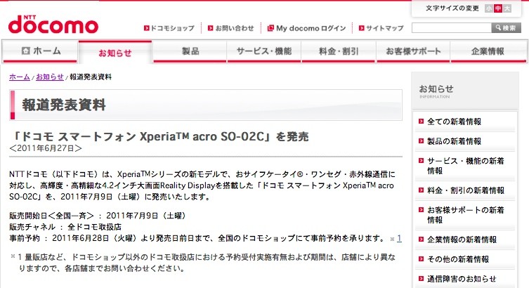 ・報道発表資料 : 「ドコモ スマートフォン Xperia(TM) acro SO-02C」を発売 | お知らせ | NTTドコモ