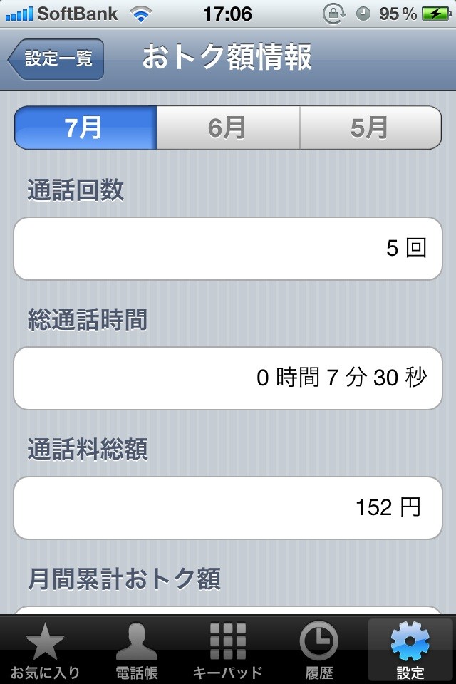 ちなみに、通話料を月毎にまとめて表示することもできます。画面右下の「設定」から「おトク額情報」をタッチすると過去3ヶ月の料金が表示されます。