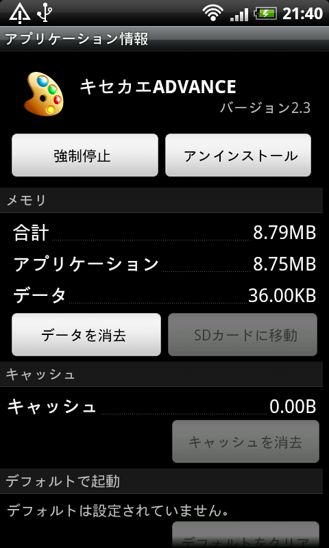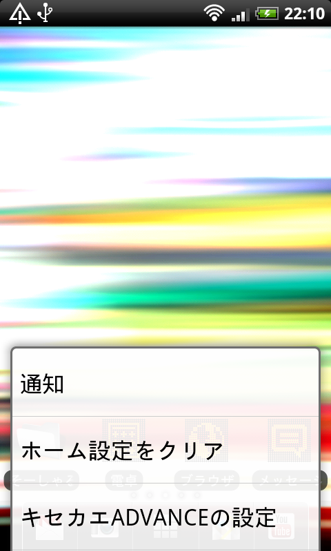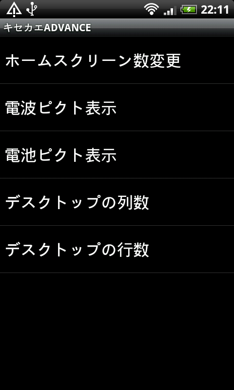 「menuキー」→「その他」→「キセカエADVANCEの設定」で行える設定が本アプリの全ての設定となる。設定できる項目は以下の通り。