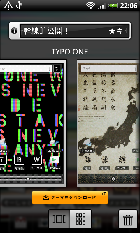 ホーム画面で「menuキー」を押して「テーマ」をタップするとテーマの選択ができる。キセカエADVANCEには、最初から3つのテーマ(光、JAPON、TYPO ONE)が用意されている。好みのテーマの画像をタップするだけで適用できる。