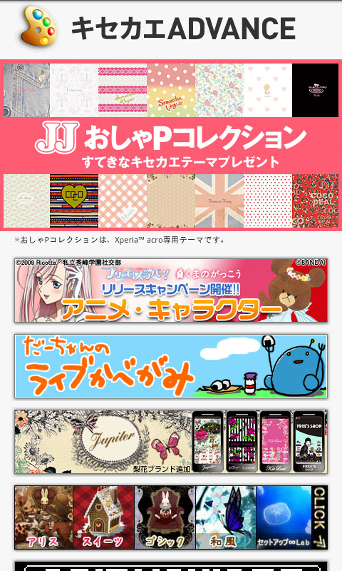 専用サイトではカテゴリ別にテーマアプリの紹介をしている。各テーマの紹介ページからAndroidマーケットへのリンクが貼られているので、好みのテーマが見つかれば、すぐにAndroidマーケットにアクセスしてダウンロードすることができる。紹介されているテーマは、数百円程度の有料アプリが中心。