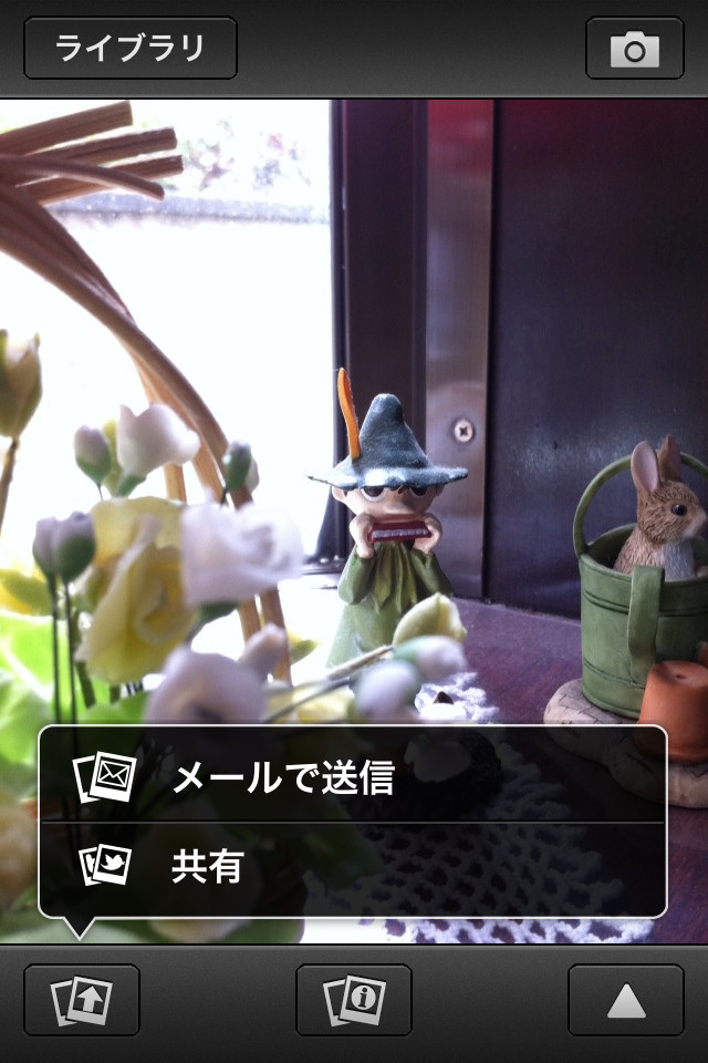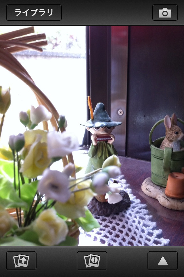 撮影したら、画面をおもむろに右フリック。するとシームレスにフォトアルバムが起動します。フォトアルバムは独自のUIとなっており、FaceBookやTwitterなどのウェブサービスとの共有機能やEXIFデータの参照が行えるなど、iPhone標準のフォトアルバム機能よりも使い易いイメージがあります。