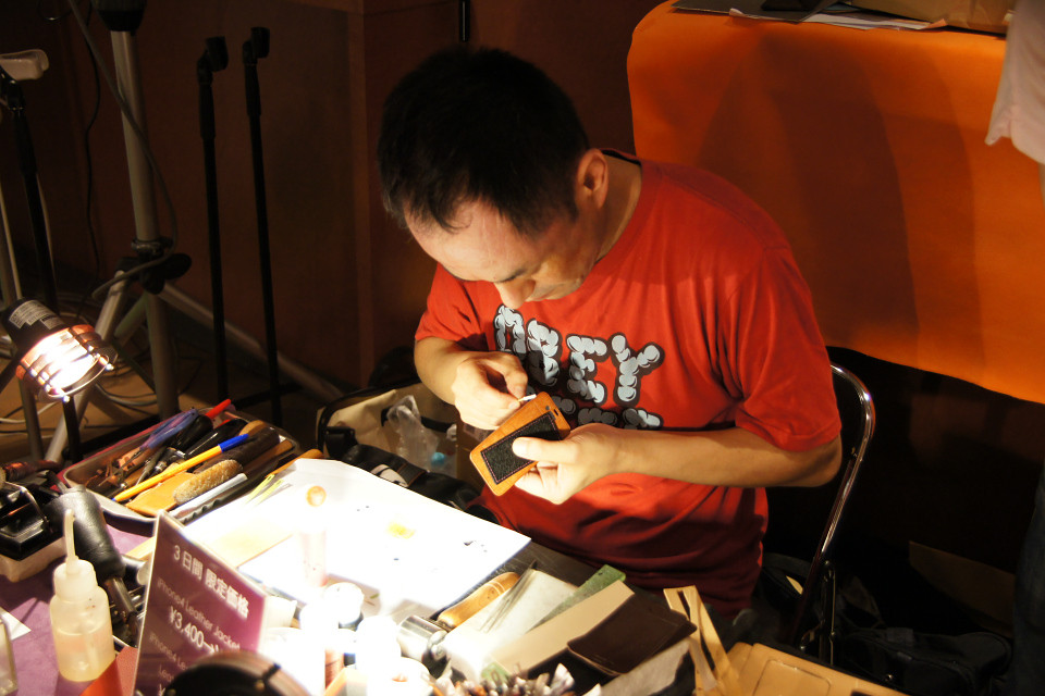dubmagic Leatherの製品はクリエイターの飯塚氏1人で作っているらしい。会場でも実演販売をしていた。