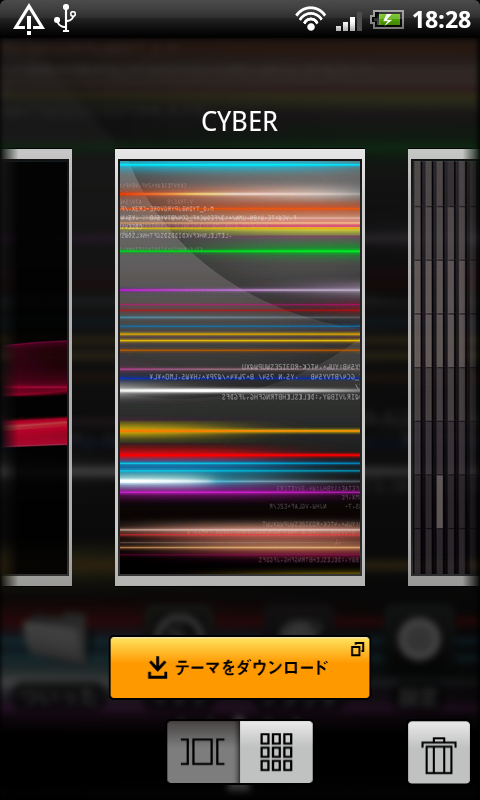 ホーム画面で「menuキー」を押して「テーマ」をタップするとテーマの選択ができる。こちらもキセカエADVANCEと同様、最初から3つのテーマが用意されているが、Stylish、CYBER、Bussinessとデザインが異なる。好みのテーマの画像をタップするれば適用される。