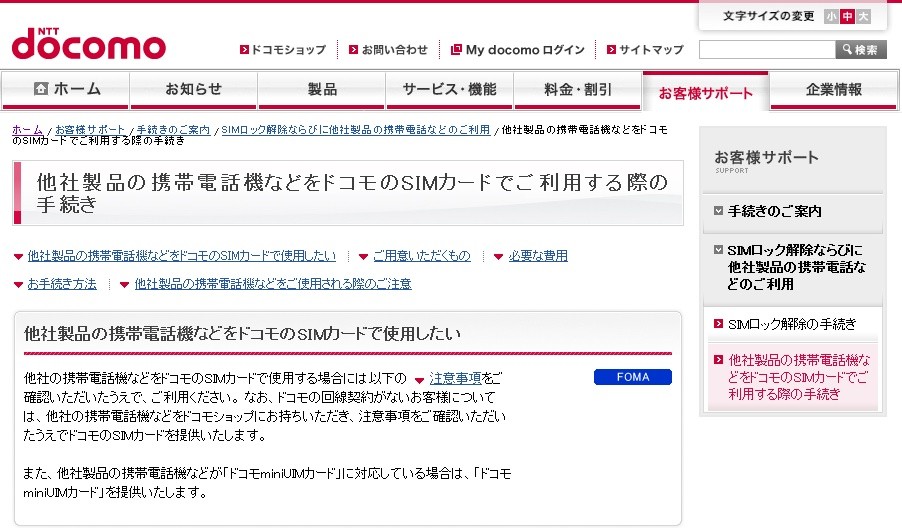 ・他社製品の携帯電話機などをドコモのSIMカードでご利用する際の手続き | お客様サポート | NTTドコモ