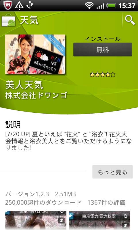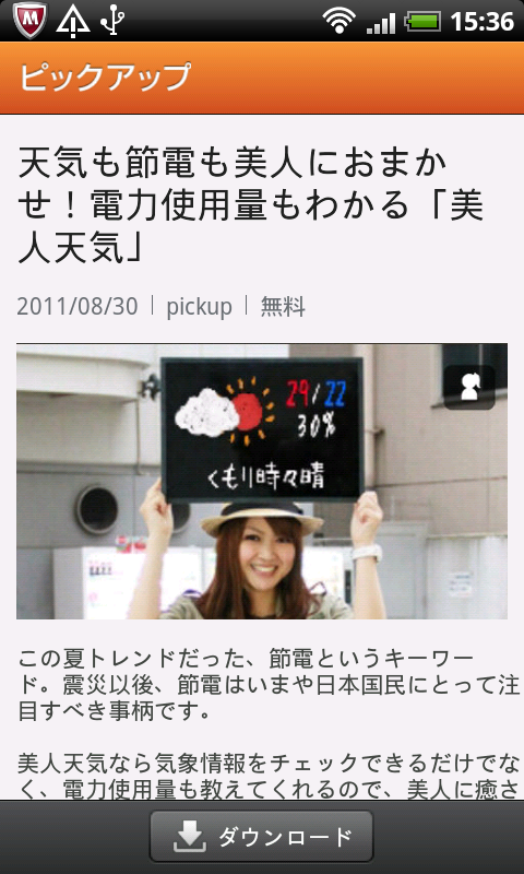 ピックアップアプリで気なるアプリをタップすると画像付きのレビュー記事を読むことができる。画面下の「ダウンロード」をタップするとAndroidマーケットのアプリページに推移し、アプリをダウンロードすることができる。