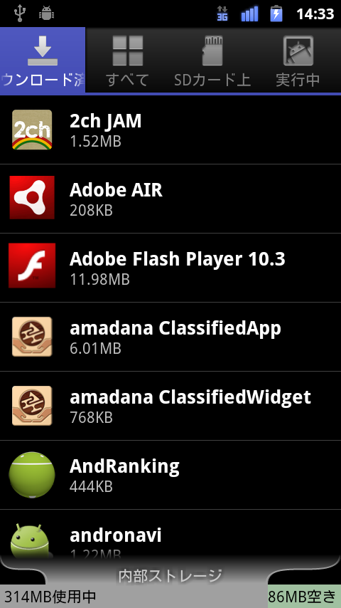android端末にダウンロードされたアプリケーション一覧が表示されます。