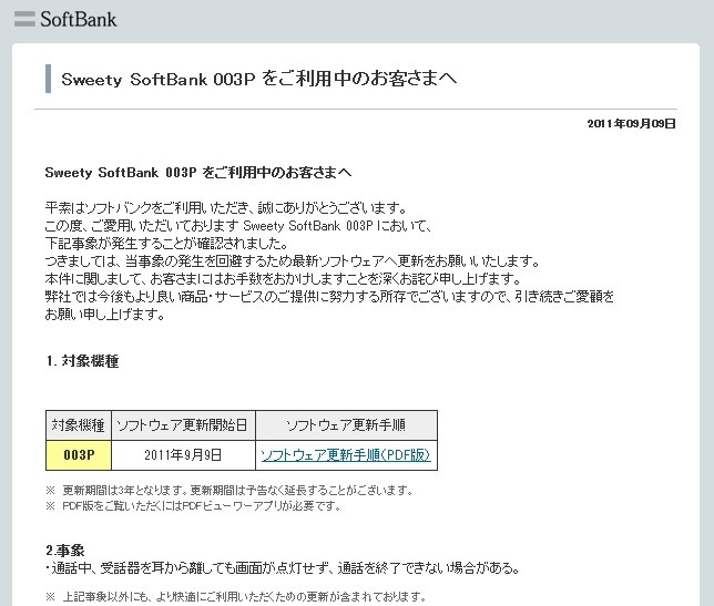 ソフトバンクモバイルは、9日、Androidスマートフォン「Sweety 003P」(パナソニック・モバイルコミュニケーションズ製)に通話機能の不具合を改善するためのネットワーク経由による本体ファームウェアのアップデートサービス「ソフトウェア更新」を提供開始したことをお知らせしています。