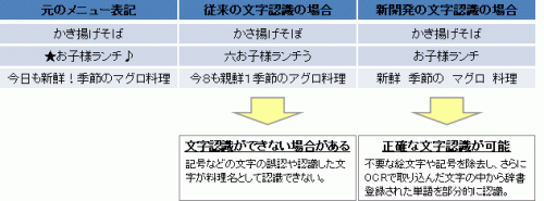 従来、携帯のカメラを使った光学文字認識処理では、取り込んだ文字が一部認識できない場合や、言葉として認識ができないことがありましたが、ドコモが新開発した技術により従来よりも文字認識の精度および速度が飛躍的に向上しました。