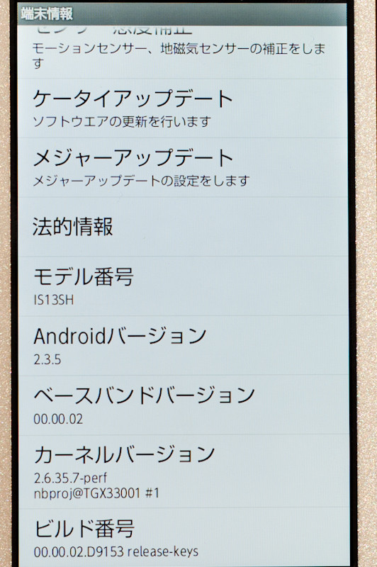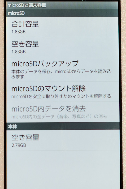 本体メモリは、保存領域として未確定となっていますが、展示機では、本体の空き容量が2.79GBあったため、搭載されているROM容量が4GBであると推測されます。外部メモリには、microSD/microSDHCカード(最大32GB/2GB同梱)に対応しています。