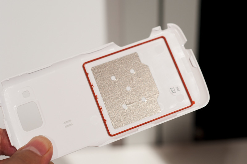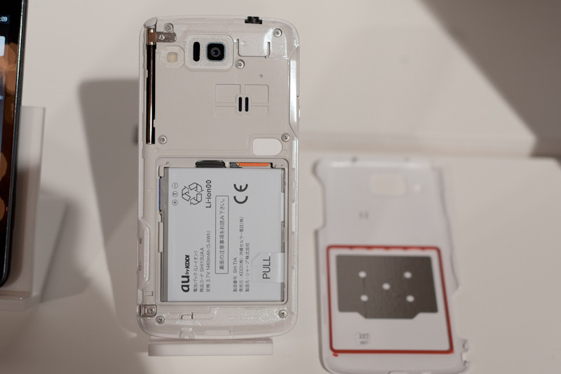 防水応なので、バッテリーカバーには、パッキンが付いています。バッテリーは、3.7V/1460mAhのリチウムイオン電池パックが採用されています。連続待受時間が約400時間(検討中)、続通話時間が約560分(検討中)となっています。バッテリーの容量は、これまでのシャープ製Androidスマートフォンとしては、大きめなのが嬉しいです。