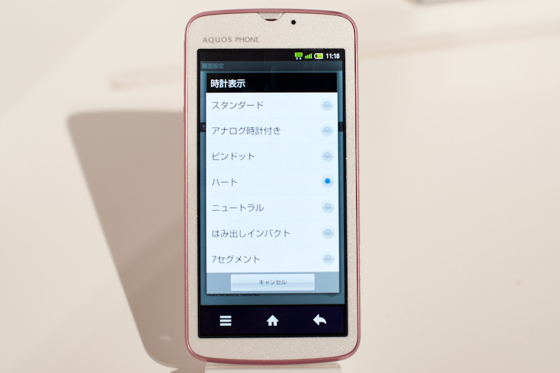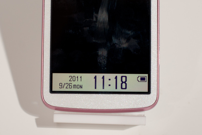 メモリ液晶は、IS03と比べると表示内容が強化されていて、メール受信時に通知に送信者名を表示することなどが可能になっています。その他、時計表示もかわいく表示するように変更できるようになりました。