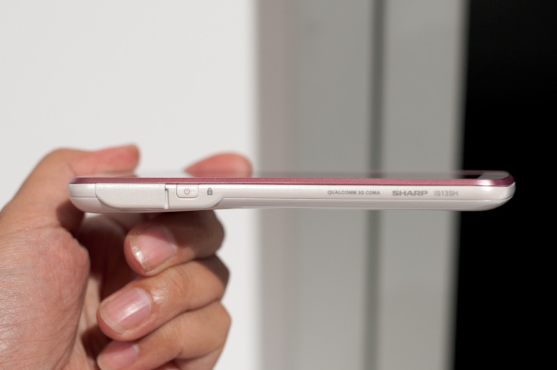 AQUOS PHONE IS13SHは、防水(IPX5/IPX7準拠)やおサイフケータイ、ワンセグ、赤外線、緊急地震速報に対応しながらも、薄さ8.9mmのスリムデザインで、手にフィットするラウンドフォルムを採用しつつスタイリッシュなデザインとなっていて、非常に持ちやすくなっています。