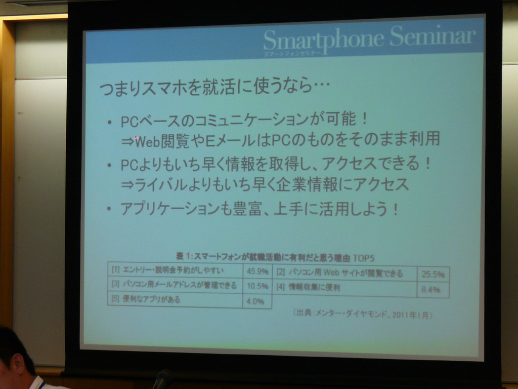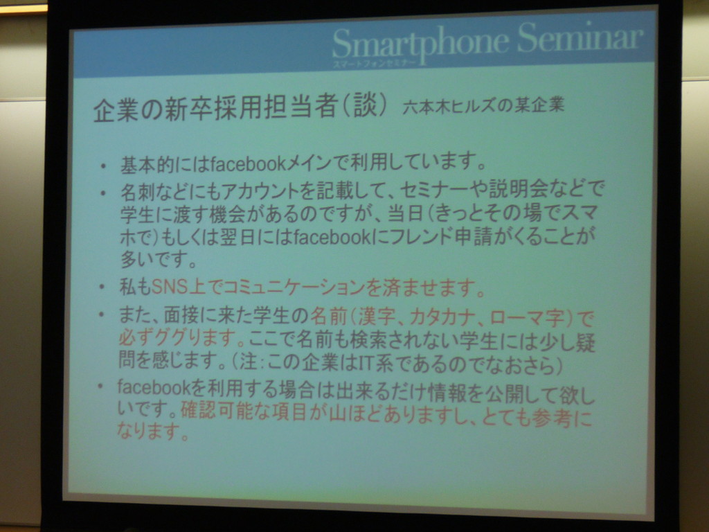昨年辺りから「スマートフォンを使うと就活に有利」と言われてきましたが、今年からは様相がさらに変わり、「SNSを活用すると就活に有利」という状況になっているとのこと。具体的な企業の採用事例を挙げて、facebookなどSNSをスマートフォンで使い、採用担当者に即時にレスポンスを取ることが就活で非常に大事である、と語る木暮さん。SNSで表に出して良い個人情報とそうでない個人情報をきちんと判断できる人材かどうか、学生がSNSで出している情報を見て、企業は採用の判断材料としているようです。大学の就職課などでは知ることのできない生きた情報に、学生の皆さんも真剣に耳を傾けていました。