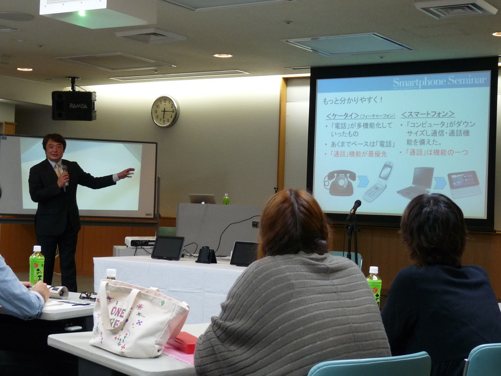まずは木暮さんがそもそもスマートフォンってどんな物?という基本的なところから説明。従来のケータイとの違いをわかりやすく説明してくれました。
